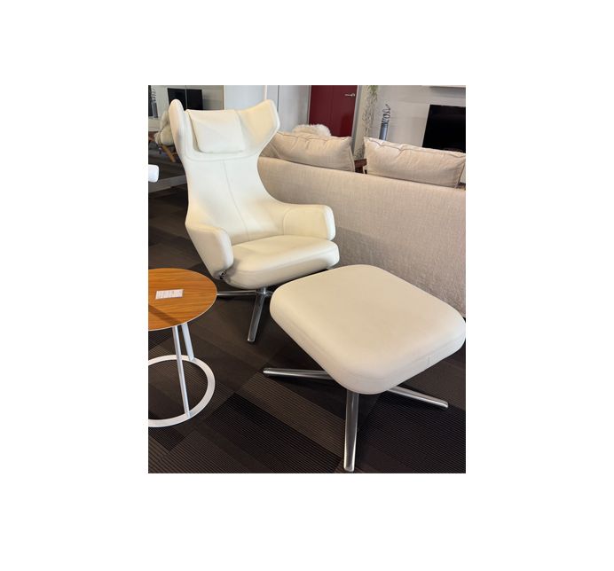 Grand Repos + Ottoman. Upholstered in L50 Snow-colored leather. Chrome base.